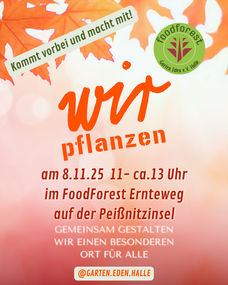 Herbstzeit ist Foodforest-Zeit! Im Rahmen des wir-Festival-Halle laden wir euch herzlich dazu ein, gemeinsam einen einzigartigen, nachhaltigen Ort für alle in Halle mitzugestalten: den FoodForest Ernteweg auf der Peißnitzinsel. Mit unserem Projekt setzen wir uns für ein lebendiges Miteinander, Naturbewusstsein und Vielfalt ein – und verwandeln Grünflächen der Stadt durch unser Engagement in einen FoodForest Ernteweg, der Gemeinschaft und Permakultur verbindet.