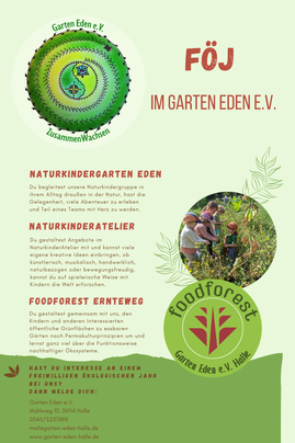 2 Freiwillige im FÖJ für den NaturkinderGarten Eden, das NaturkinderAtelier und das FoodForest-Projekt. Bei Interesse meldet euch gern.